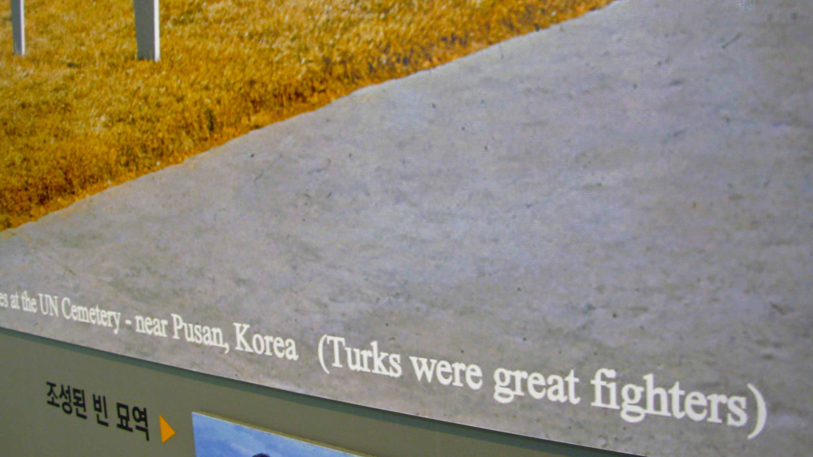 Busan Kulesinde fotoğraf sergisindeki fotoğraflardan birinde, Türk Şehitliği’nin eski hali görünüyor. Altta göğsümüzü kabartan bir cümle; “Türkler büyük savaşçılardı”.