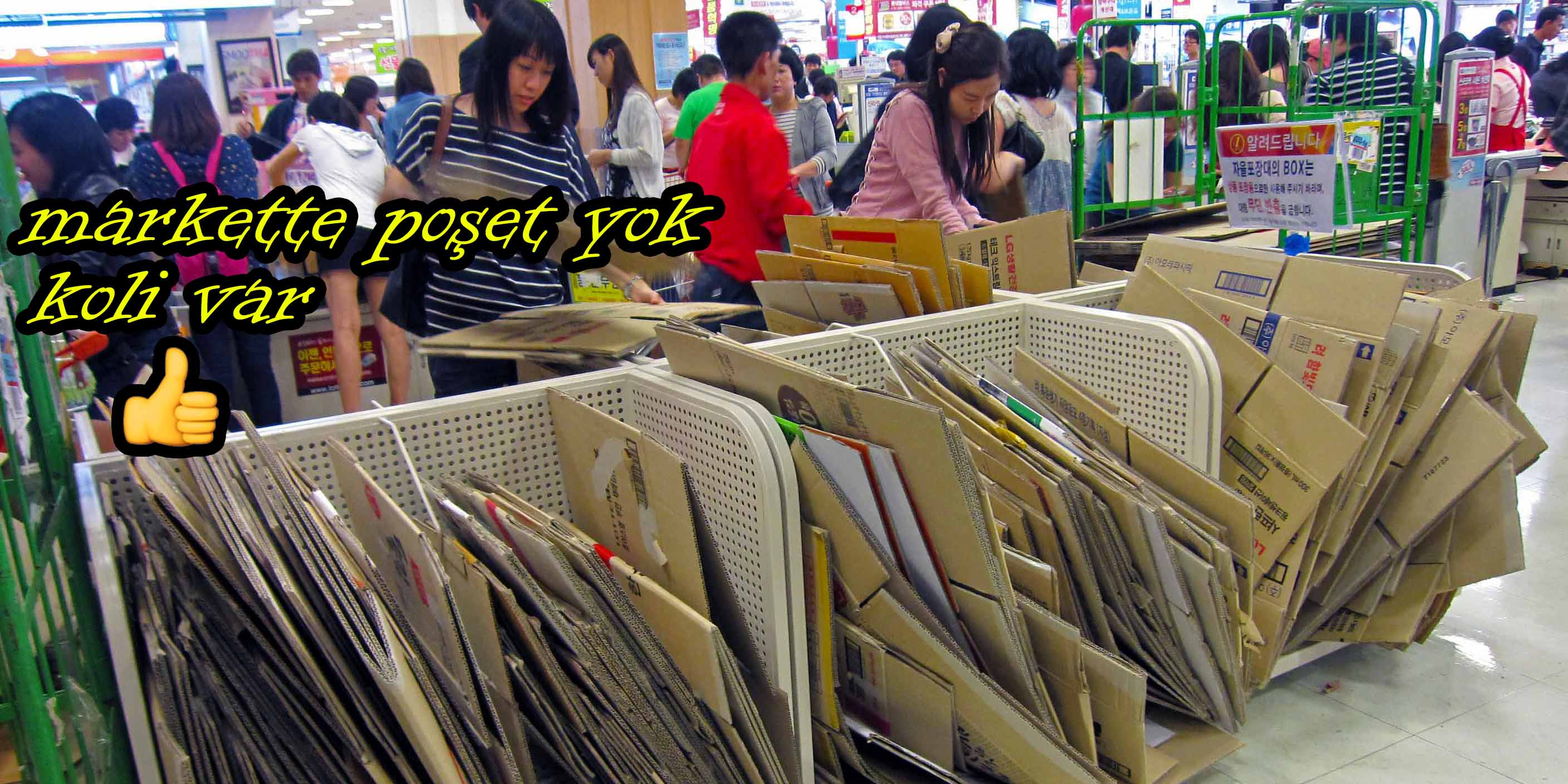 Geri gönüşüm ve çevre için gerekli önlemler de alınmış. Markette poşet paralı, kutu ise parasız. Alışveriş sonrası aldıklarını kutuluyorlar.